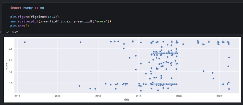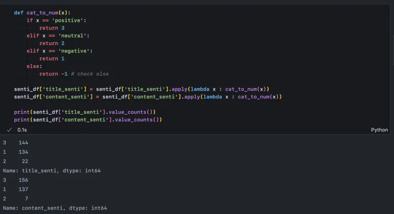 positive는 3점, neutral은 2점, negative는 1점으로 하고 확신도(score)를 곱해줄 것이다. 이를 title과 content에 각각 적용하여 두 데이터를 산술평균하는 방식으로 감성을 계량화하겠다.