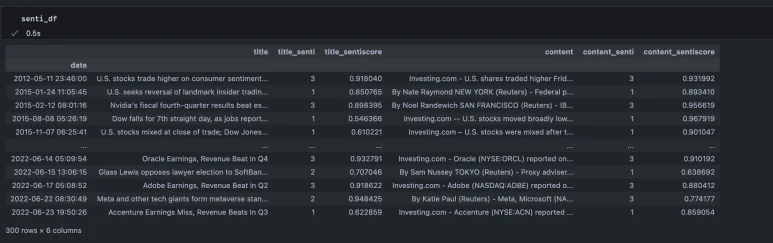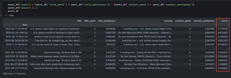 특히 title에 대한 분류가 중립 감성(neutral) 비중이 높은 것을 보아 title 만으로 감성을 분류할 수 없는 케이스가 있고, content까지 확인했을 때 더 정확히 분류된다는 것을 확인할 수 있다. 따라서 우리는 title과 content 분류 결과를 모두 활용해 새로운 감성 score 값을 만들 것이다.