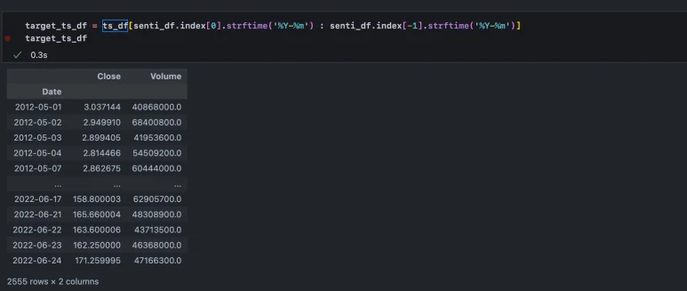 먼저 주가 데이터는 전체 기간에 대해 가져왔기 때문에 뉴스 기사 데이터가 있는 시점만 추출한다.