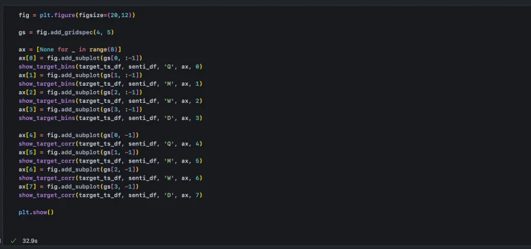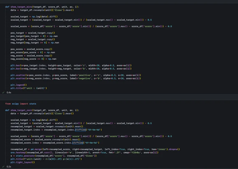 show_target_bins() 함수는 특정 기간(분기, 월, 주, 일) 별로 스케일링된 주가와 스케일링된 감성 score의 시계열 분포를 보여주고, show_target_corr() 함수는 그것의 상관 분포를 보여준다.