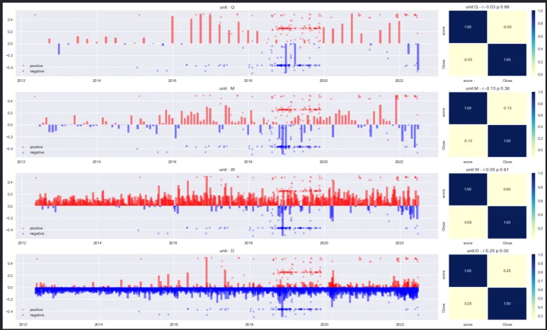 우측 상관 분포 표 타이틀에는 뉴스 기사에 대한 감성 스코어(scaled)와 각 기간(분기, 월, 주, 일) 별 주가(scaled)의 피어슨 상관 검정 결괏값을 표기했다. r은 상관계수, p는 p-value를 의미한다.