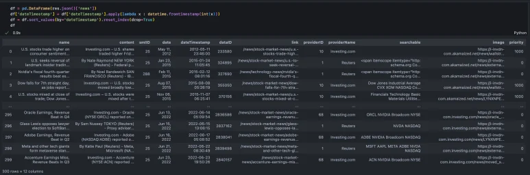 실습에서는 최근 300개의 뉴스 기사를 불러와 데이터 프레임으로 만들어줬다.