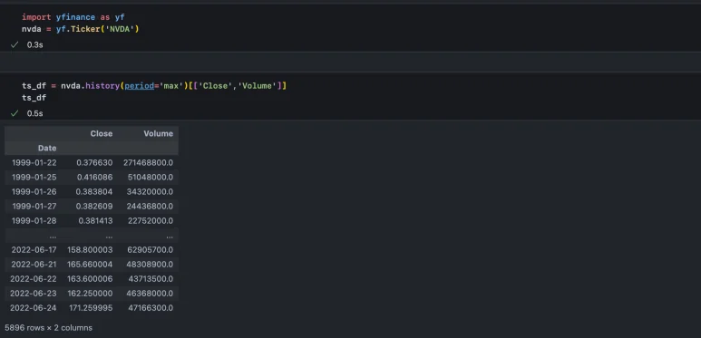 주가 데이터는 간단하게 yahoofinance 데이터를 가져오는 yfinance 패키지를 사용해 전체 기간 데이터를 불러온다. 여기서 Close(종가)만 사용할 것이다.