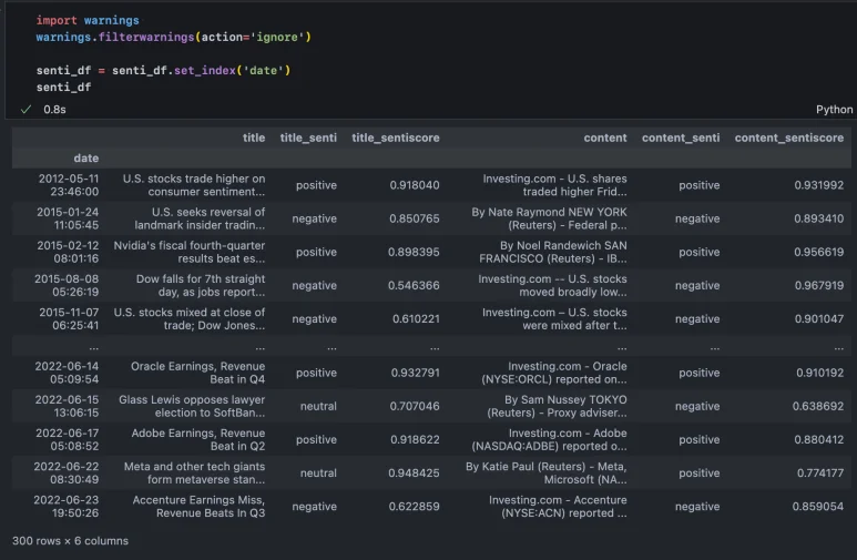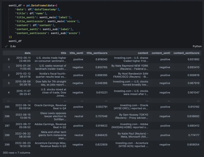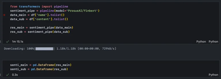 Hugging Face를 통해 배포된 모델을 가져오는 가장 단순한 방법은 transformers 패키지의 pipeline 함수를 사용하는 것이다. 아래와 같이 코드를 작성해주면 감성 분류 모델이 각 뉴스 데이터에 대해 평가(분류) 한다.