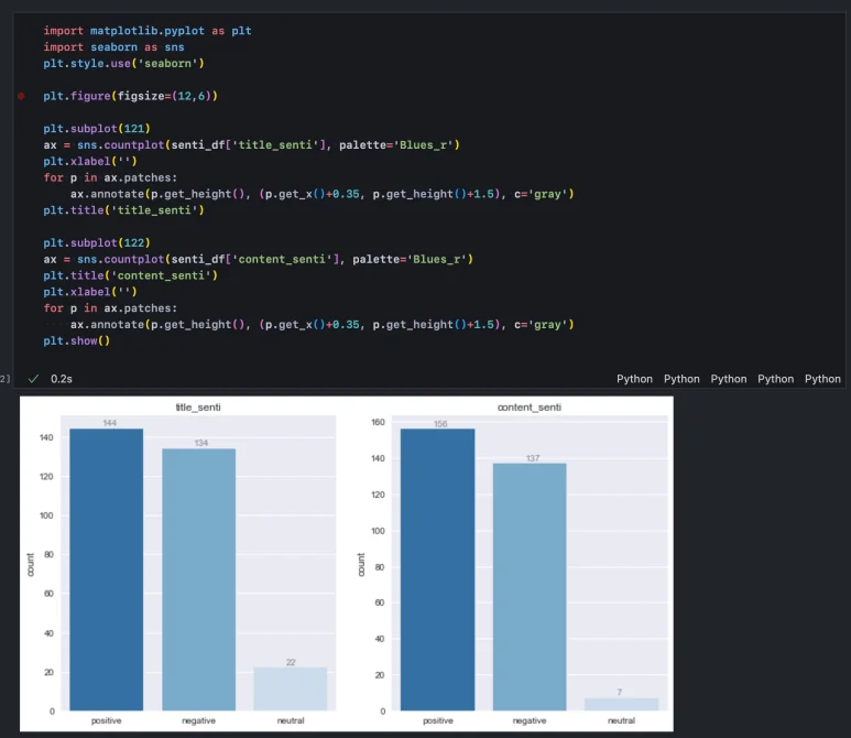 title(뉴스 기사 제목)과 content(뉴스 기사 본문 일부)는 같은 기사에 대한 정보지만 텍스트 내용이 다르기 때문에 감성 모델이 다르게 평가할 수도 있다. 그러나 뉴스 기사 제목이 내용을 대표하므로 어조나 분위기가 유사할 것이라 짐작할 수 있고, 따라서 분류 결과의 차이가 너무 크면 모델을 신뢰하기 어렵다. title과 content에 대한 감성 분석 결과를 시각화해보자.