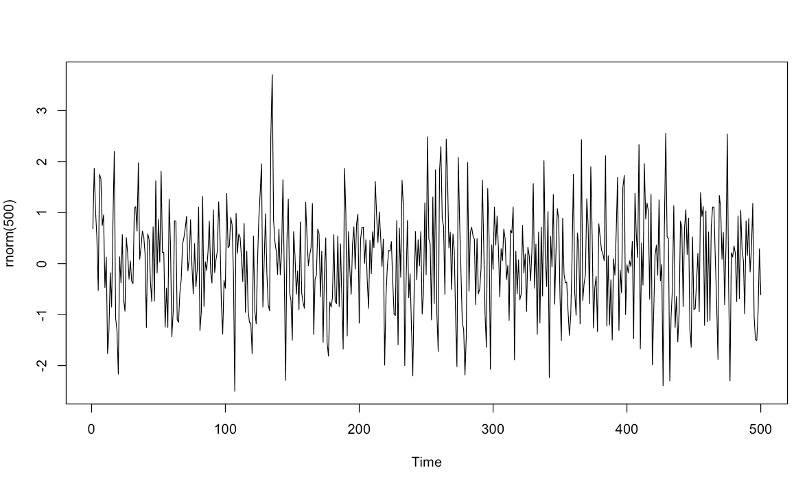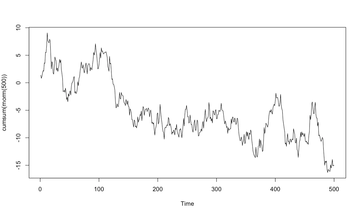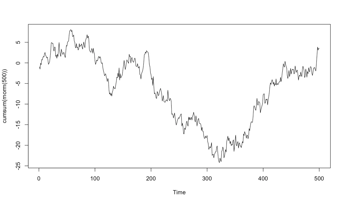 그리고 이것을 누적해서 쌓아 올리면(cumulative sum) 위에서 봤던 500일간의 누적 수익률, 즉 약 2년 간의 주식차트를 로그변환시킨 것과 동일한 모양새가 나온다.(주식차트를 로그변환하면 복리효과를 제거하여 시간에 따라 증가하는 비선형적 추이를 선형적으로 바꿔준다.)