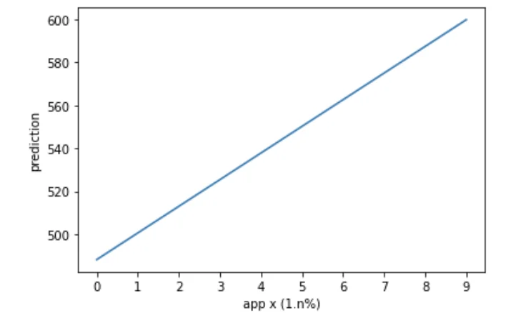 매우 높은 예측 정확도를 가진 선형 회귀 모델을 완성했다. 이 모델을 사용해 app 사용 시간이 늘어남에 따라 연간 지출액이 어떻게 상승할지 예측해보자.