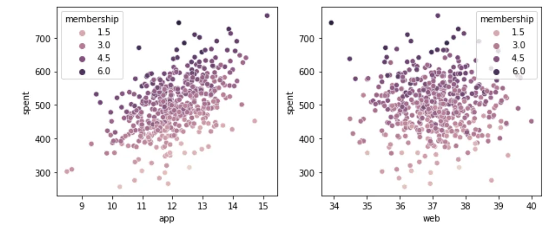 - H1: 유저의 가입 기간이 길수록 연간 지출액은 높다. (주요 컬럼: spent~membership)