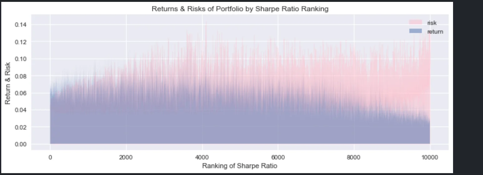 포트폴리오의 샤프지수가 높을 수록 수익률과 변동성이 어떤지 눈으로 확인하고 싶다. 따라서 같은 X축(샤프지수 내림차순)을 놓고 수익률과 변동성을 y축으로 그려본다.