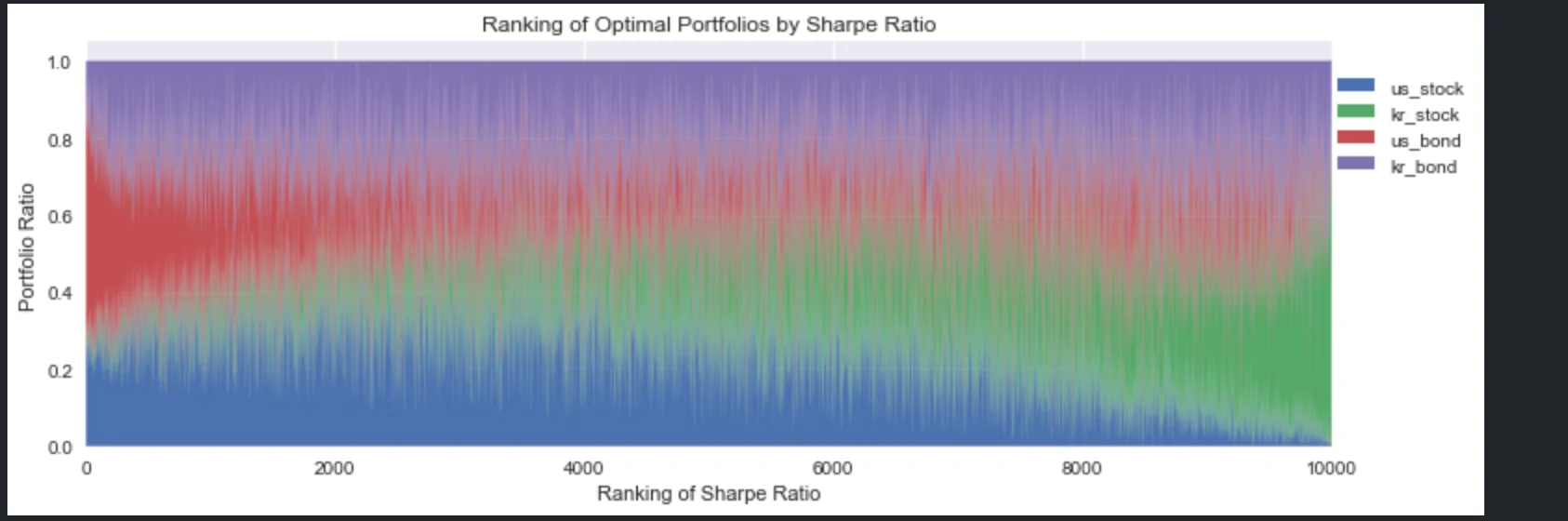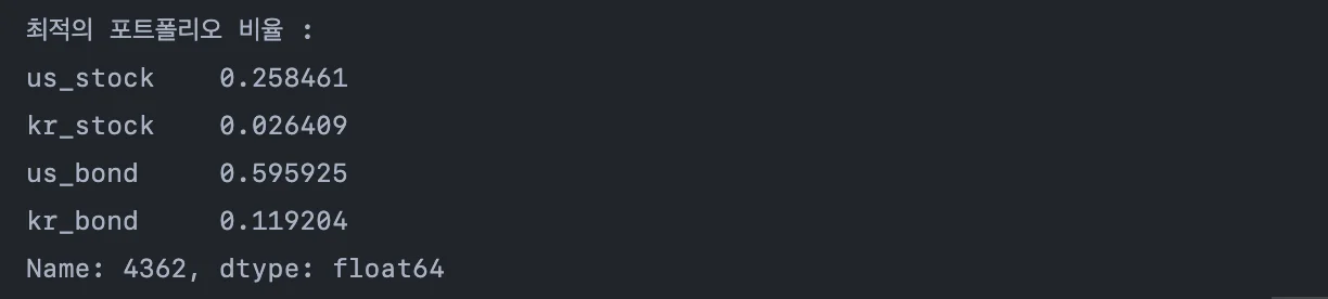 왼쪽으로 갈수록 샤프지수가 가장 높은 포트폴리오다. 샤프지수가 높을수록 미국 채권의 비중이 높아지고, 한국 주식 비중은 낮아지는 것을 알 수 있다. 한국 국채와 미국 주식의 비중은 남는 포지션에 적절히 배분하는 것이 좋겠다.