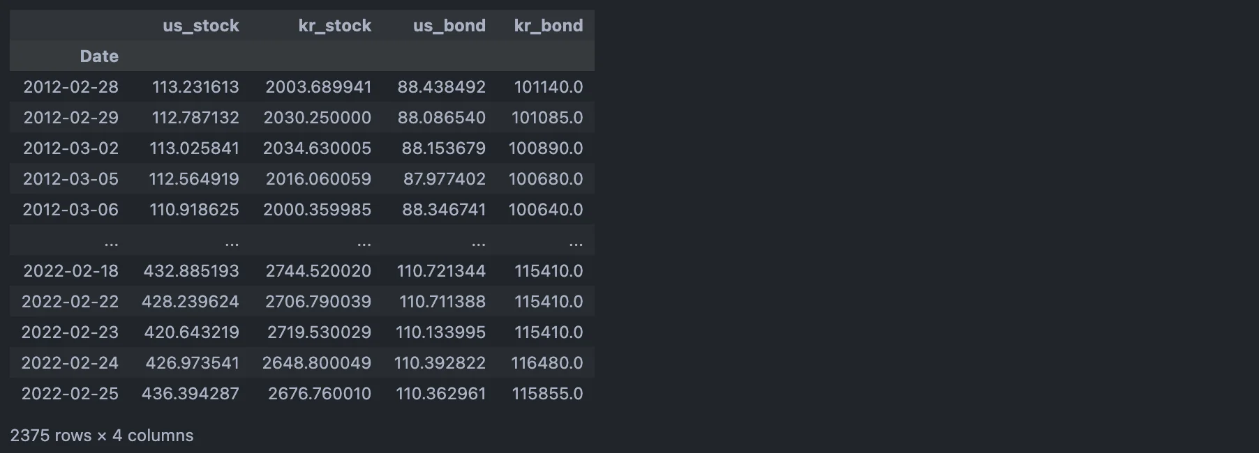 yf_price.columns = ['us_stock','kr_stock','us_bond','kr_bond']