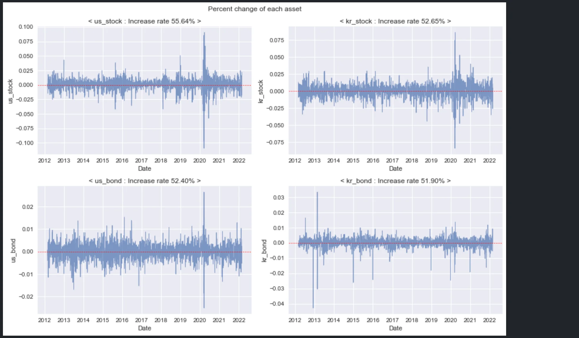 미국 주식은 S&P500 지수를, 한국 주식은 코스피 지수를 사용하며 채권은 각 국가의 7~10년물 국채 가격을 사용한다.