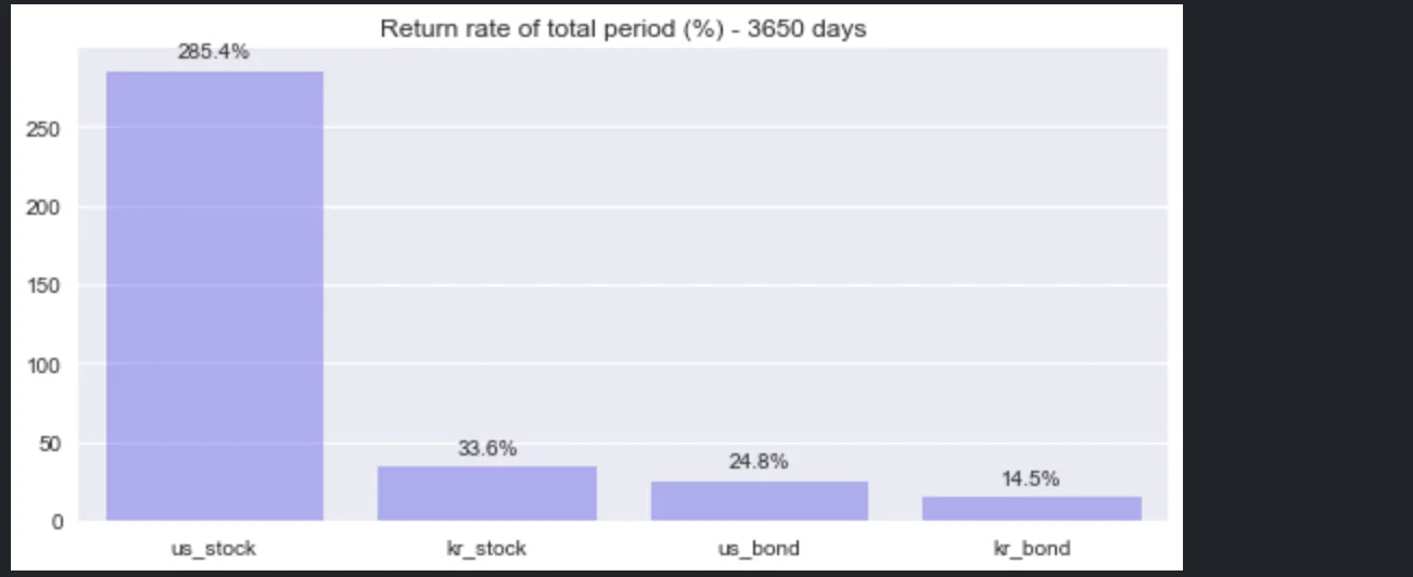 그래서 만약 미국 국채와 주식, 그리고 한국 국채와 주식으로 포트폴리오를 구성한다면, 2012년 2분기부터 2022년 1분기까지의 수익률 기록을 토대로 볼 때 아래의 비율이 최적의 포트폴리오가 된다.