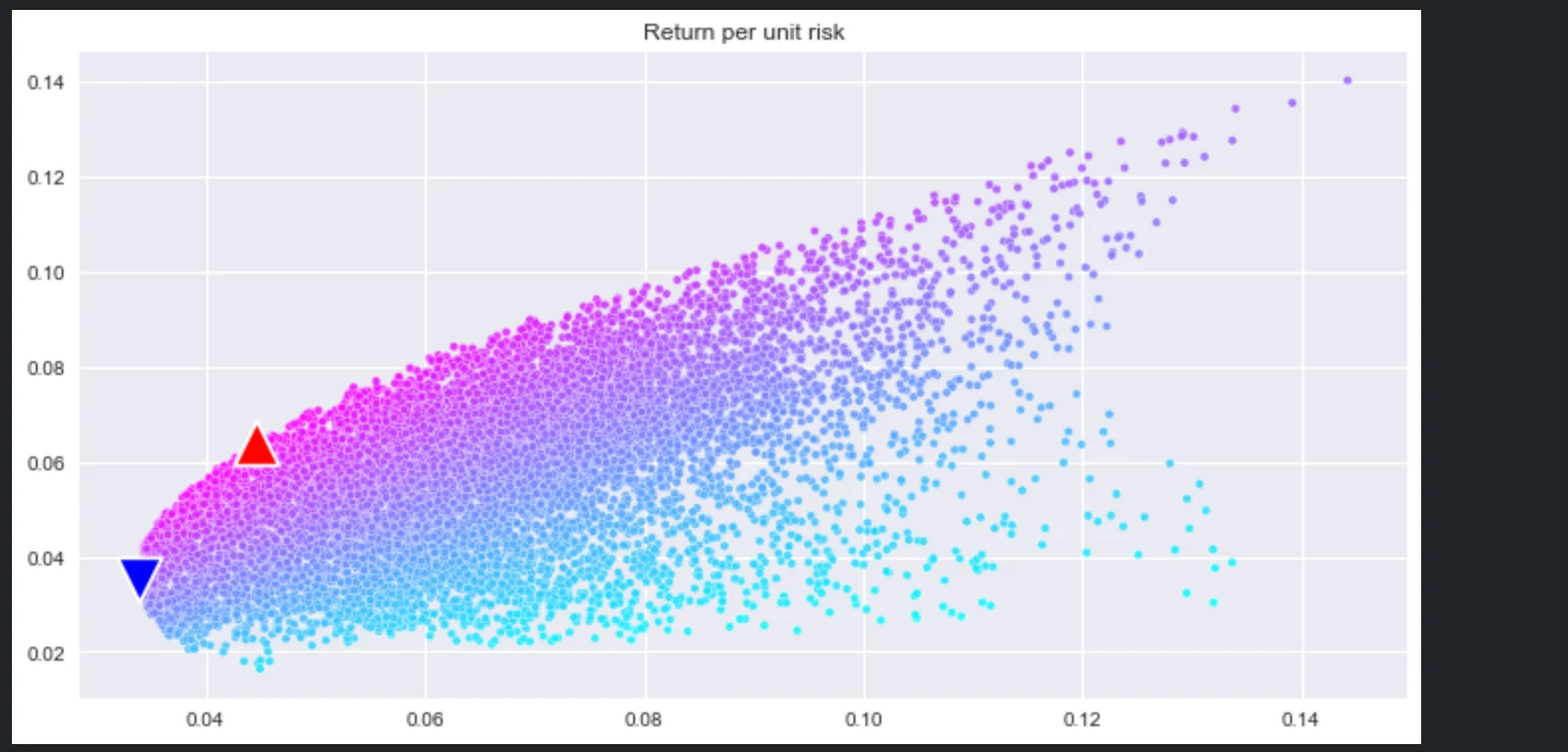 아래 차트는 1만개의 무작위 포트폴리오를 리스크 대비 수익률로 보여주고 있다. 그중에서 샤프지수가 가장 높은 것과 변동성이 가장 낮은 것을 각각 빨간색 삼각형, 파란색 삼각형으로 표시해줬다.