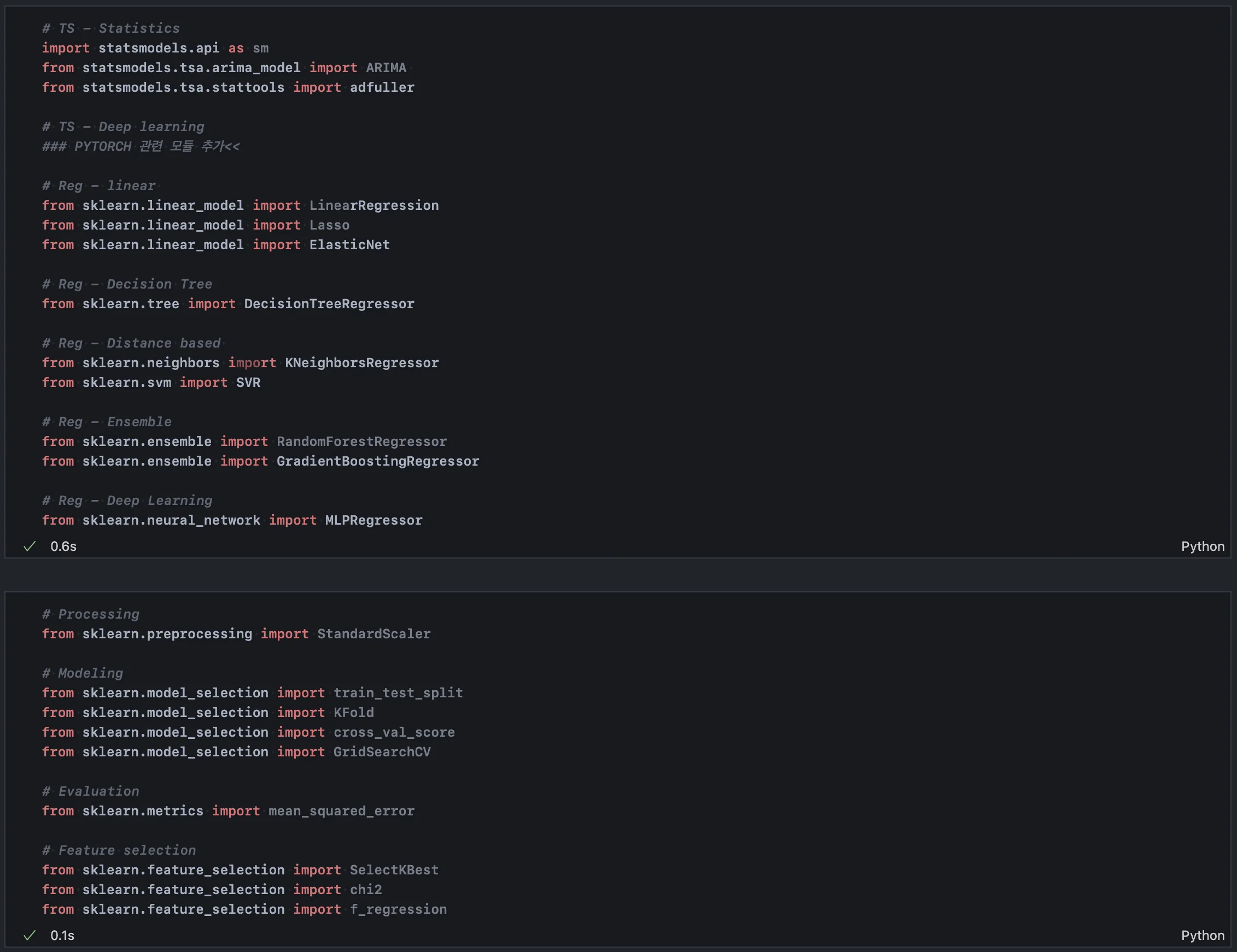 예측 분석을 수행할 모델을 선택하기 위해서는 모델링 과정에서 여러 모델을 비교 분석하게 된다. 우리는 회귀 예측을 목표로 하며 이를 위해 선형 모델, 트리 기반 모델, 거리 기반 모델 및 앙상블 모델을 기본적으로 사용할 예정이다. 또 scikit-learn에서 제공하는 신경망 모형도 함께 불러왔으며 이는 이후 신경망에 ‘기억’의 개념을 포함하는 LSTM 모델과 비교하기 위함이다. LSTM은 다분히 시계열스러운 분석기법이므로 대표적인 시계열 모델 ARIMA와 함께 구현해 볼 것이다. 추후 PyTorch 혹은 Keras를 사용해 LSTM을 구현할 것인데, 자주 사용하는 패키지가 있다면 미리 불러와도 좋다.