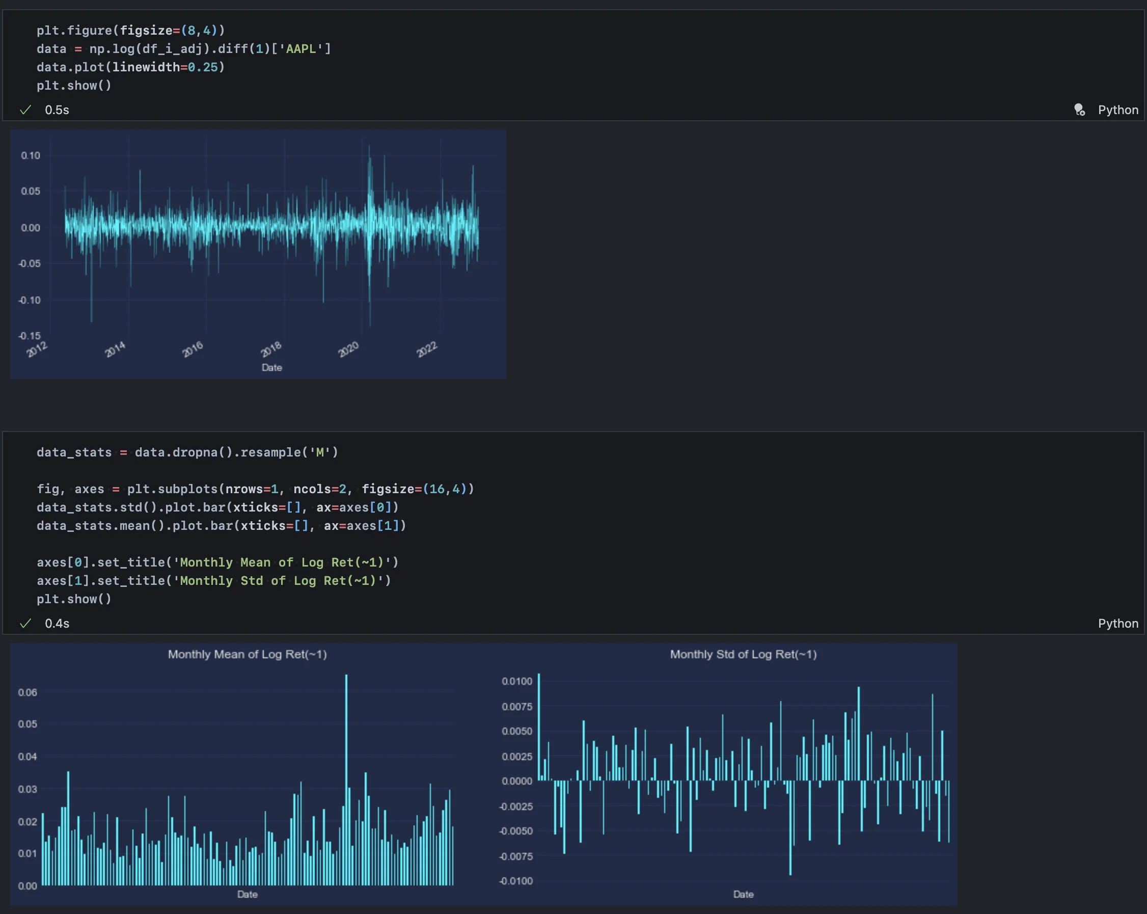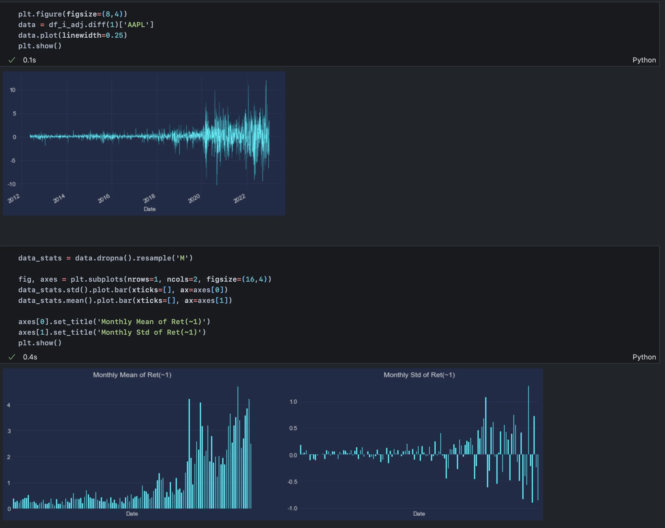 위 첫 번째 차트는 주가의 일간 변화량(어제 대비 오늘의 주가)을 보여준다. 기본적으로 주가에는 복리 효과가 내재되어 있다. 즉 지수적인 상승이 발생하는데, 이에 따라 단순히 어제와 오늘의 주가 차이를 늘어뜨려놓으면 점점 그 진폭이 커진다. 예를 들어 주가가 20달러일 때와 200달러일 때 1% 변화량은 각각 0.2달러, 2달러로 10배가 차이 난다. 특히 애플의 경우에 정석적으로 주가가 우상향 한 케이스이므로 이런 효과가 여실히 드러나는 것이다. 그래서 파이썬을 사용한다면 pct_change를 통해 단순 변화량이 아닌 상대적 비율로써 변화량(%)을 확보할 수 있으나 편의상 log 처리하는 것이 일반적이다. log 처리를 한다는 것의 기술적 맥락은 주가 데이터 분석을 위한 로그 변환의 의미를 참고하길 바란다.