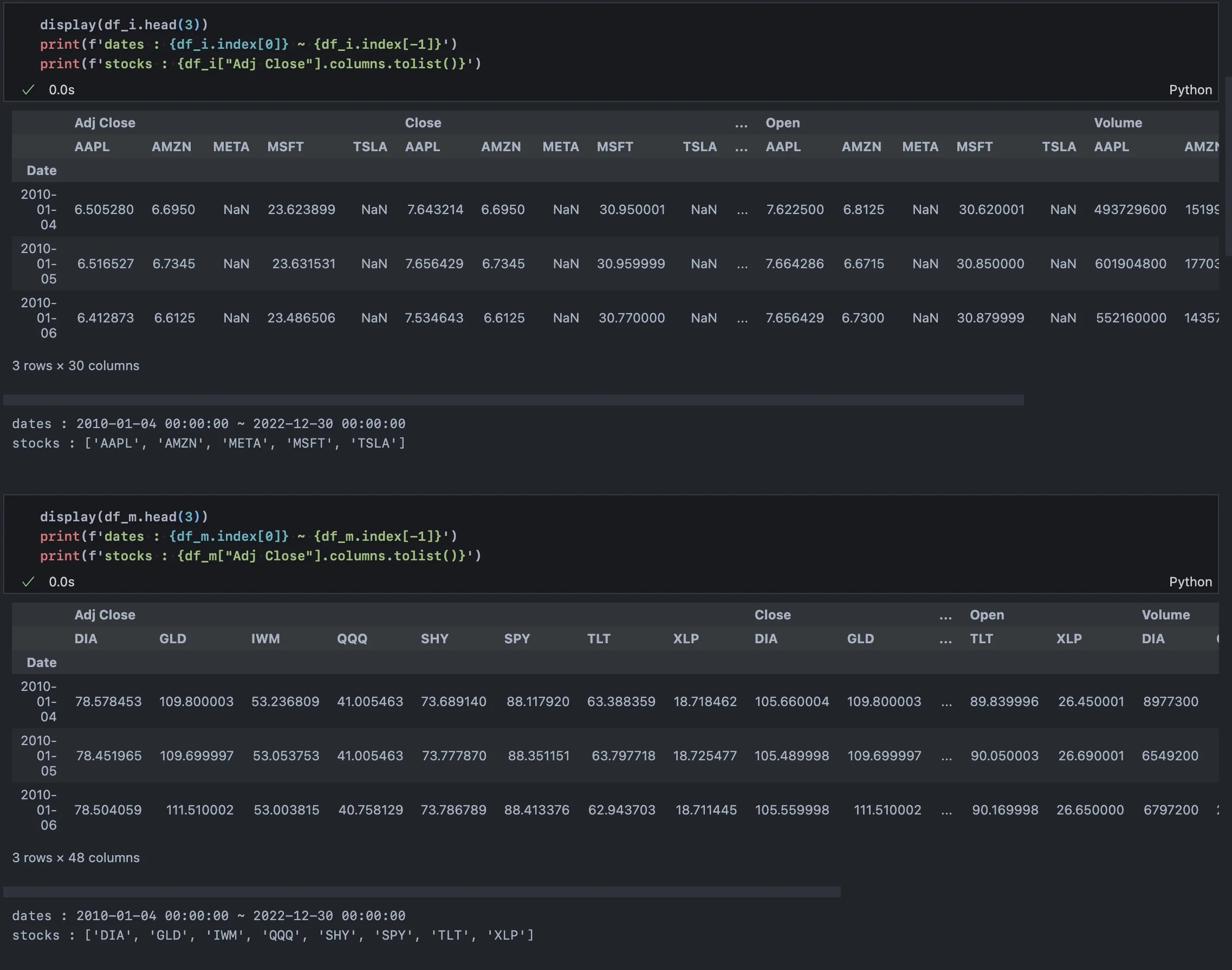 tickers_i는 동종 산업 내 연관자산의 티커명(좌측부터 애플, 테슬라, 마이크로소프트, 메타, 아마존), tickers_m은 시장 내 연관 인덱스 티커명(주석으로 표기)이다. 우리는 시계열 예측을 위해 애플 주가의 과거 데이터(자기상관성 활용)뿐만 아니라 동시간 대의 연관 자산 및 시장 움직임을 모두 포함한 횡/종단면 데이터를 통합 활용할 것이다.