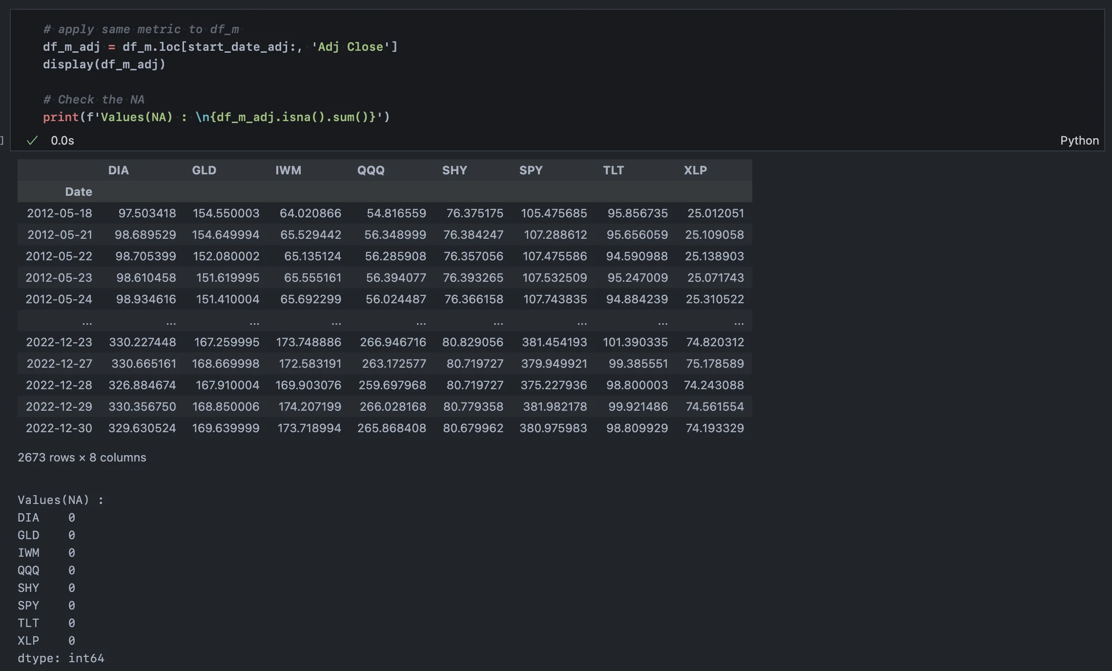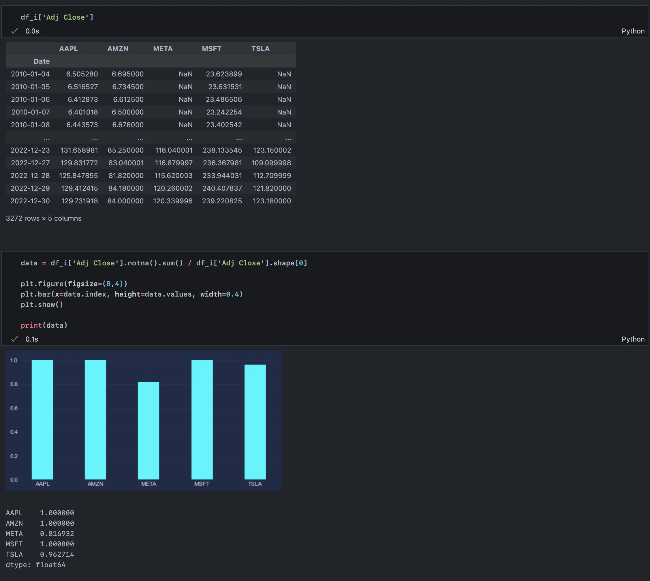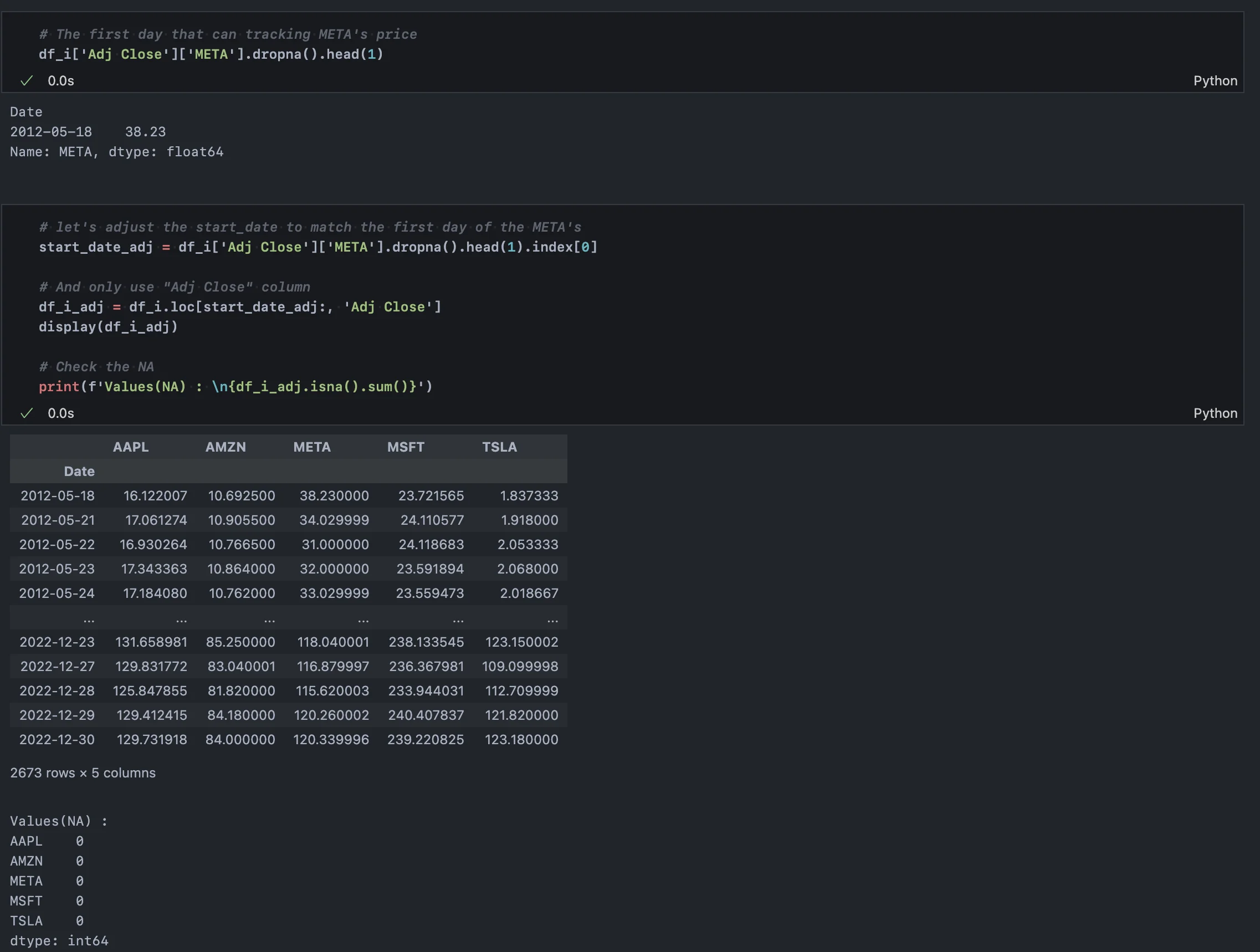 자산 그룹(df_i)의 수정종가(Adj Close) 데이터로 누락값을 확인해보자. META의 경우 약 18%, TSLA는 약 4%가 부족하다. 앞에서 우리는 2010년부터의 주가정보를 불러왔으나 사실 주가 예측에 10년 전 데이터를 사용하는 경우는 많지 않다. 시장 국면이 빠르게 달라지기 때문이다. 따라서 미리 충분한 데이터를 불러온 만큼 META의 기준에 맞게 18%가량의 과거 데이터를 제거해주자.