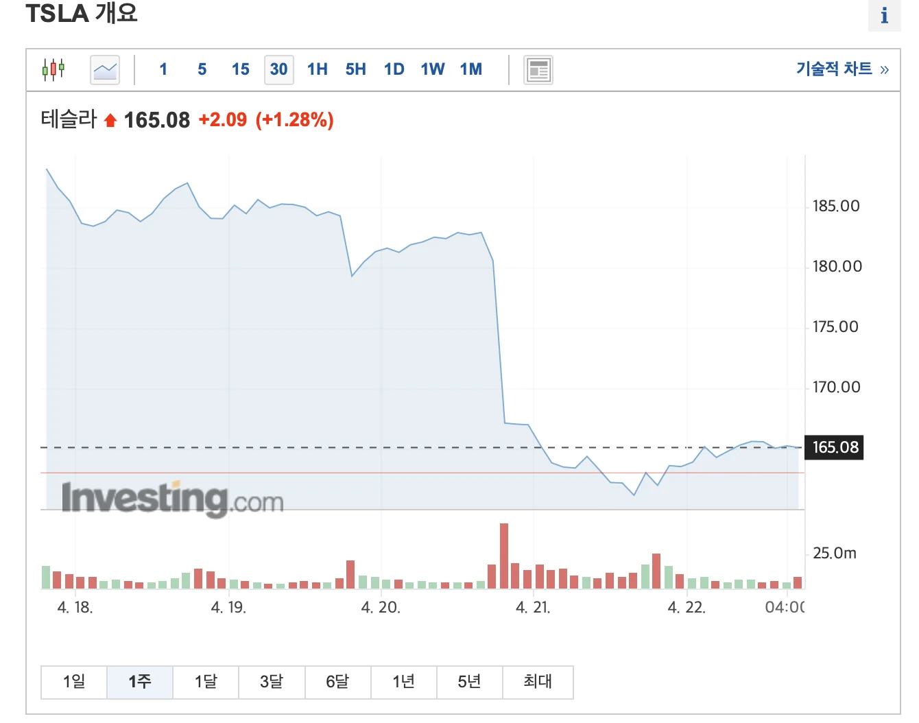 이번에는 더 미시적으로 살펴보자. 이번 한 주(4.17 ~ 4.22) 간 테슬라 주가 움직임은 어떤가? 이전 3일(4.18~4.20)의 주가와 이후 2일(4.21~4.22)의 주가가 같은 분포를 띈다고 할 수 있을까? 그렇다면 이전 3일(4.18~4.20)의 주가로 모델링한 예측 모델이 향후 2일(4.21~4.22)의 주가를 제대로 예측할 수 있을까? 절대 그렇지 않다. 모델은 말 그대로 데이터를 학습하고, 본 것만 기억한다. 즉, 패턴이 달라지면 모델도 달라져야 한다.