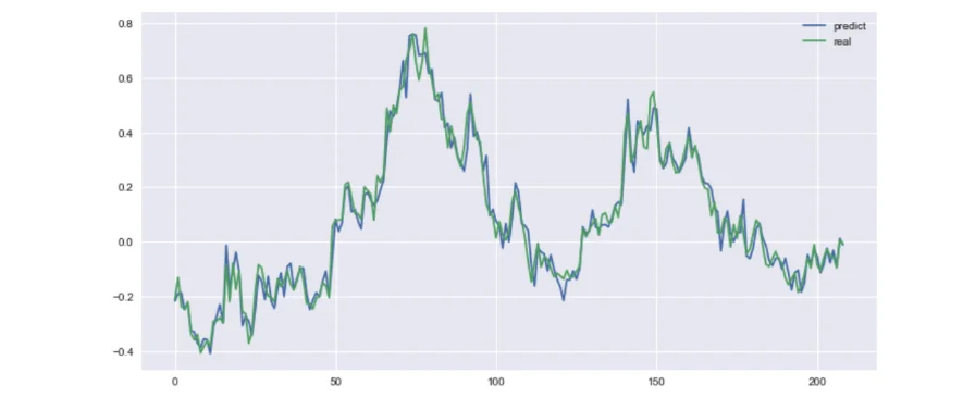 두 그래프를 함께 그려놓고 보면 그렇게 보일 수밖에 없다. 오늘의 주가가 떨어졌지만 올랐다고 예측했더라도 전체적으로 놓고 보면 두 차이가 크지 않기 때문에 계속해서 두 선이 겹치며 그려지게 되기 때문이다.