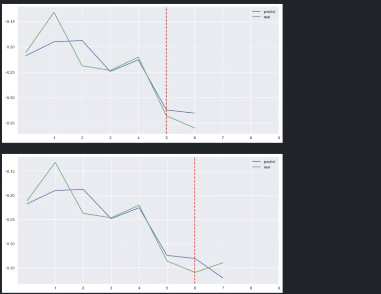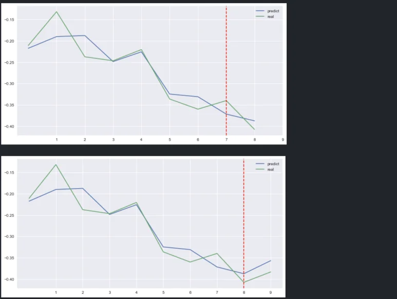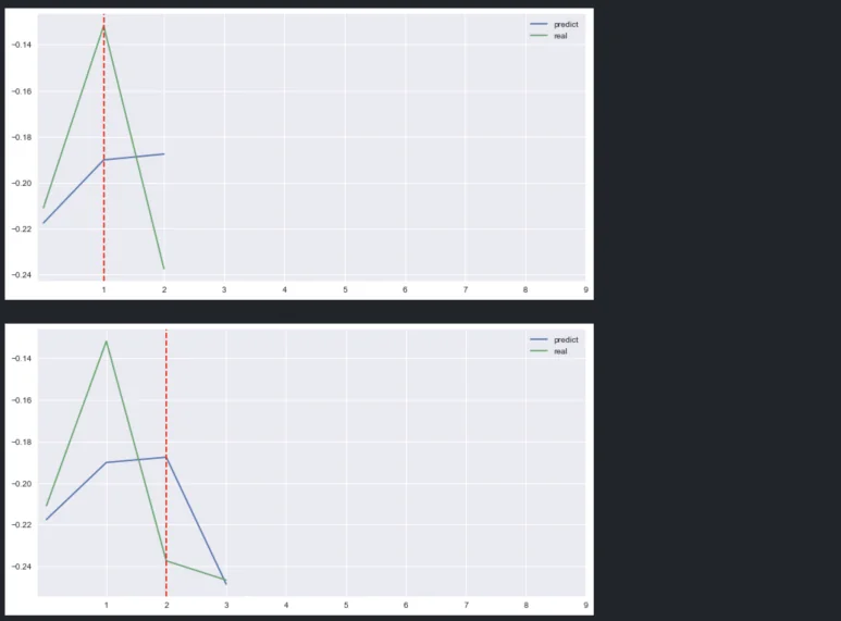 딥러닝을 잠깐 접해본 분들은 이 그래프를 보고 ‘에이, over-fitting 됐네’라거나, ‘미래 데이터를 학습에 사용했네’라고 지적할 수 있다. 하지만 해당 모델은 over-fitting이 생길 만큼 복잡한 모델을 쓰거나 loss를 과하게 줄이지 않았으며(단순 회귀모형 사용), 위에 보이는 기간은 학습용으로 사용하지 않은, 모델이 처음 보는 데이터를 사용했다.