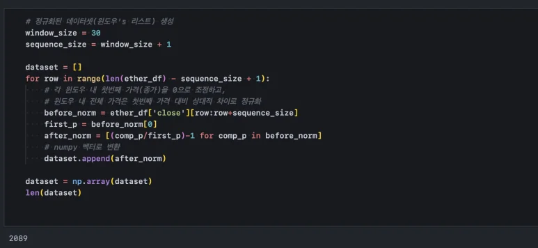 하나의 윈도우가 X(과거 30일 치) 라면 예측하고자 하는 다음날 하루는 y다. 따라서 하나의 학습 시퀀스 사이즈는 예측하고자 하는 하루와 과거 30일(윈도우 사이즈)을 합친 31일이 되고, 이러한 조합으로 데이터 셋을 구성하는 코드는 다음과 같다.