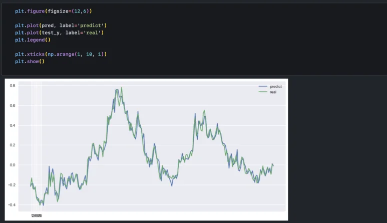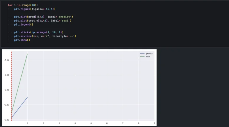 이것이 학습자 입장에서는 과정과 결과를 그대로 받아들이고, 실제 투자까지 이어질 수 있기 때문에 꽤나 위험한 일일 수 있다고 생각한다. 따라서 지난 며칠을 가지고 다음 며칠을 예측하는 모델인지 확인하고, 하루치 예측이라면 타깃 지점인 하루에 대한 결과만 놓고 해석하는 것이 바람직하겠다.