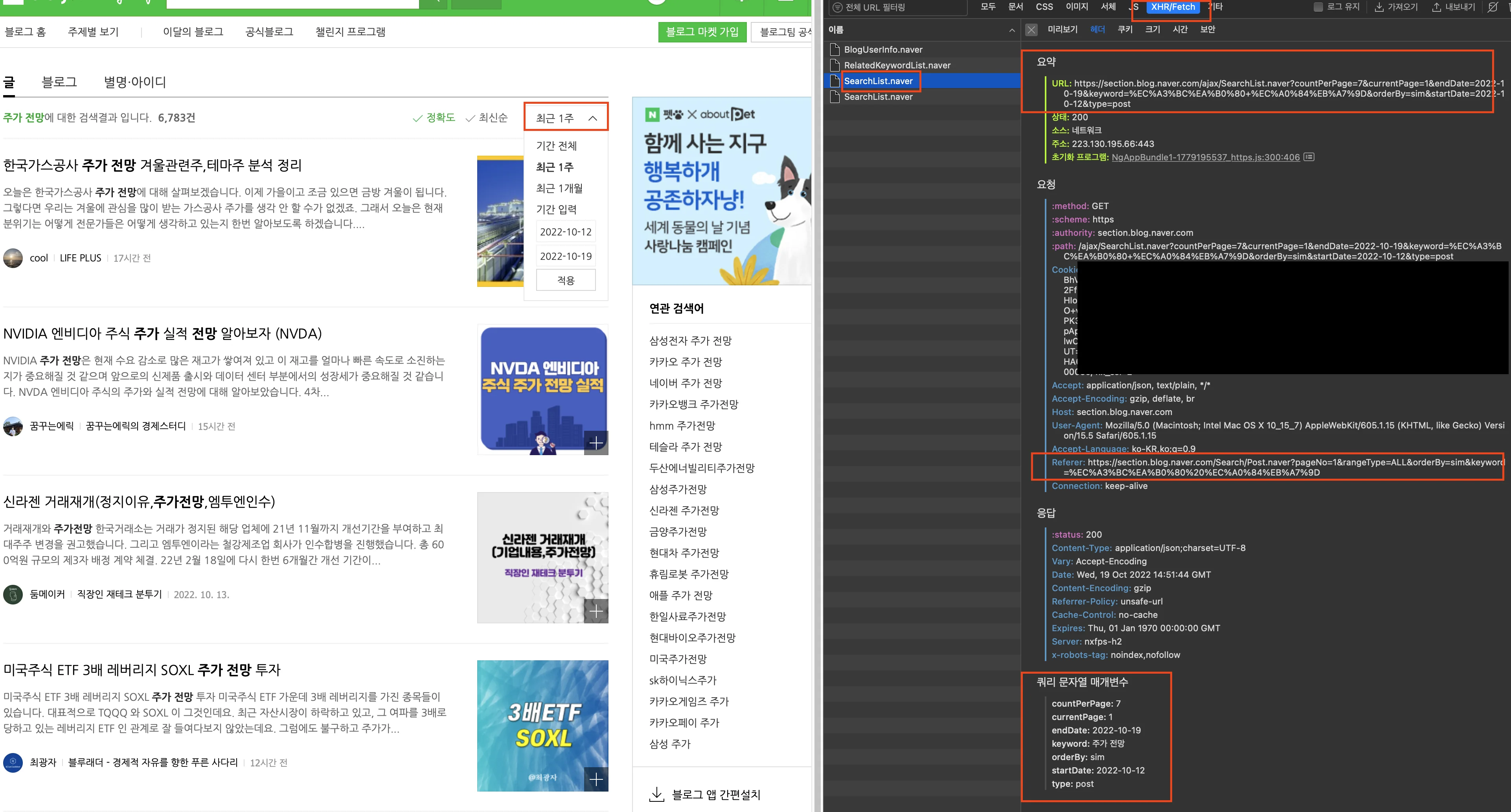 미리 보기를 통해 반환된 문서들을 살펴보면 그중 SearchList.naver에 우리가 찾는 데이터가 있는 것을 확인할 수 있다. 이제 파이썬으로 해당 자료를 가져올 수 있으면 된다.