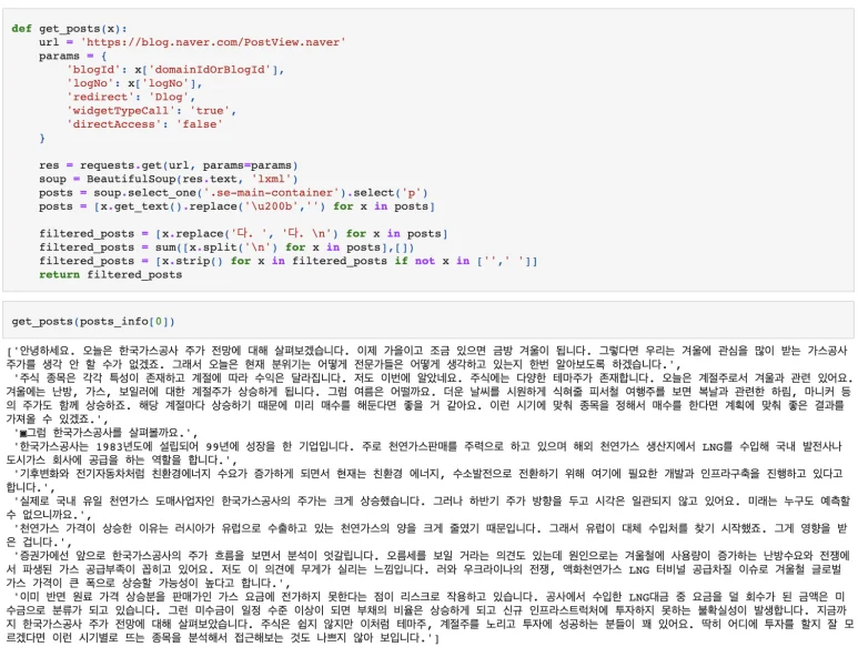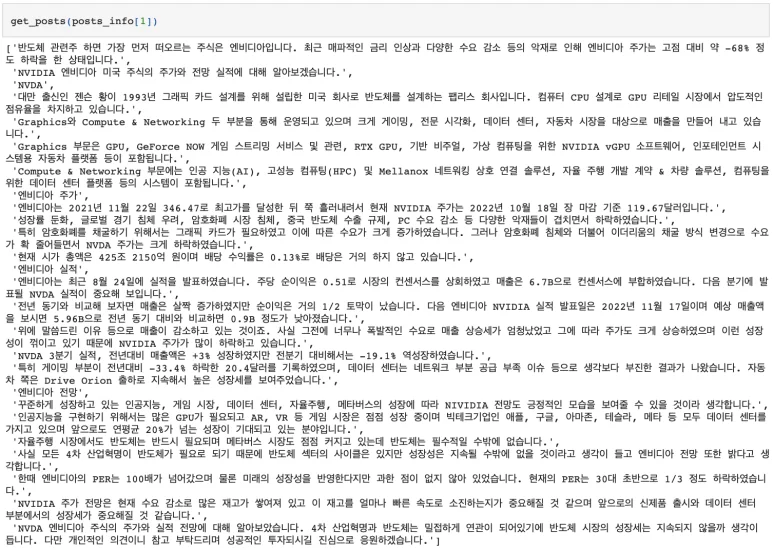 이번에는 함수로 바로 만들어주겠다. select_one 함수로 본문을 가져오고 select(‘p’)를 해줌으로써 본문 내 모든 문장들을 리스트로 추출한다. 또한, list comprehension 문법을 통해 각 리스트 내 요소에서 텍스트만 추출해 다시 리스트로 저장하고, 제어문자(u200b는 폭 없는 공백이다. 네이버 블로그 포스팅 시 자동으로 문자 사이에 포함됩니다.)는 없애준다.