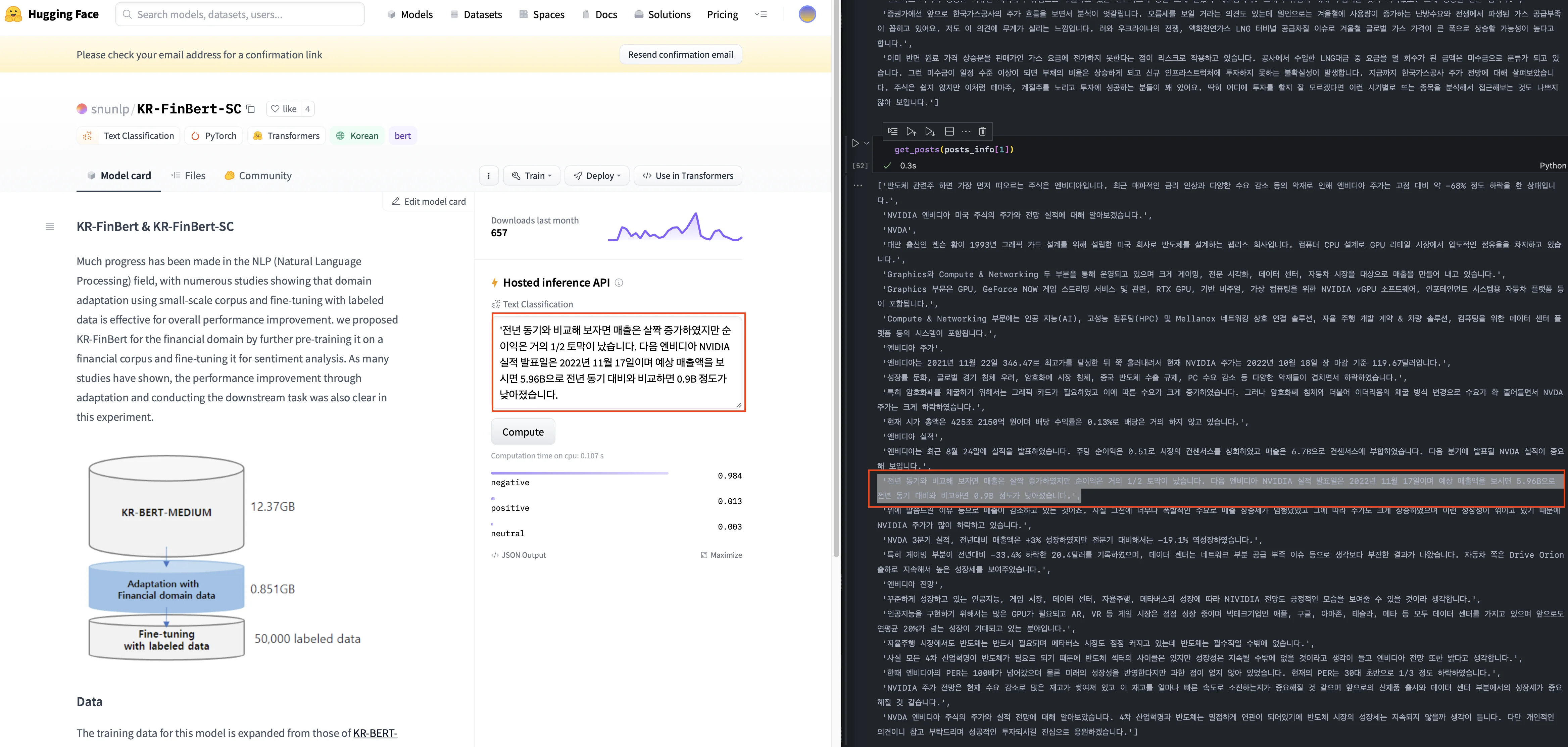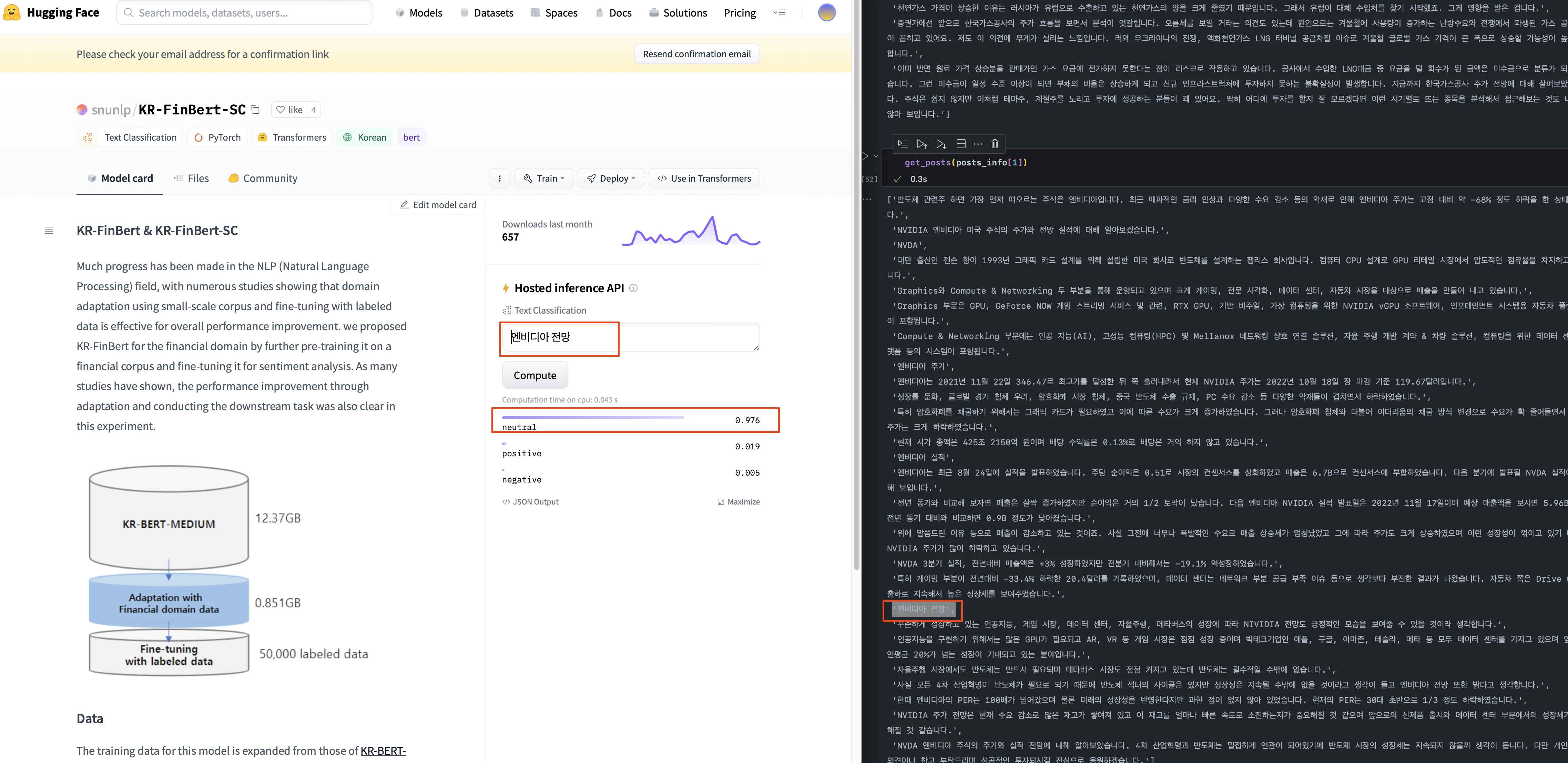 감성 분류, 그중에서도 금융 텍스트에 특화된 한국어 모델이 이미 허깅페이스에 올라와 있다. 해당 모델을 테스트해 보고 사용 여부를 판단한다.