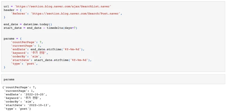 currentPage는 현재 페이지 번호, countPerPage는 페이지당 포함하는 포스팅 수, endDate와 startDate는 지난 7일간을 지정해 주고 keyword는 검색한 값을 보여준다. 이렇게 파라미터 파악이 끝났으면 코드 작성을 위해 필요한 라이브러리를 호출하겠다.