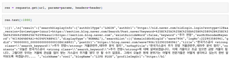 requests 모듈을 통해 데이터를 불러온다. 결괏값을 확인했을 때 우리가 앞서 봤던 SearchList.naver의 미리 보기 값과 형태가 동일해야 한다. 텍스트 앞부분만 짧게 출력하자.
