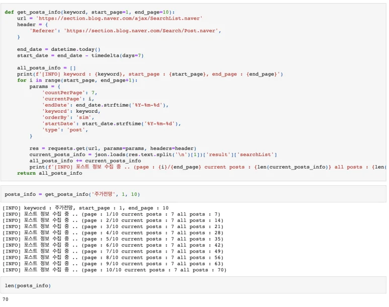 이제, 앞서 구현한 코드들을 종합하여 키워드와 페이지 번호만 넣어주면 지난 7일간의 포스팅 정보를 긁어올 수 있는 함수를 정의하겠다.