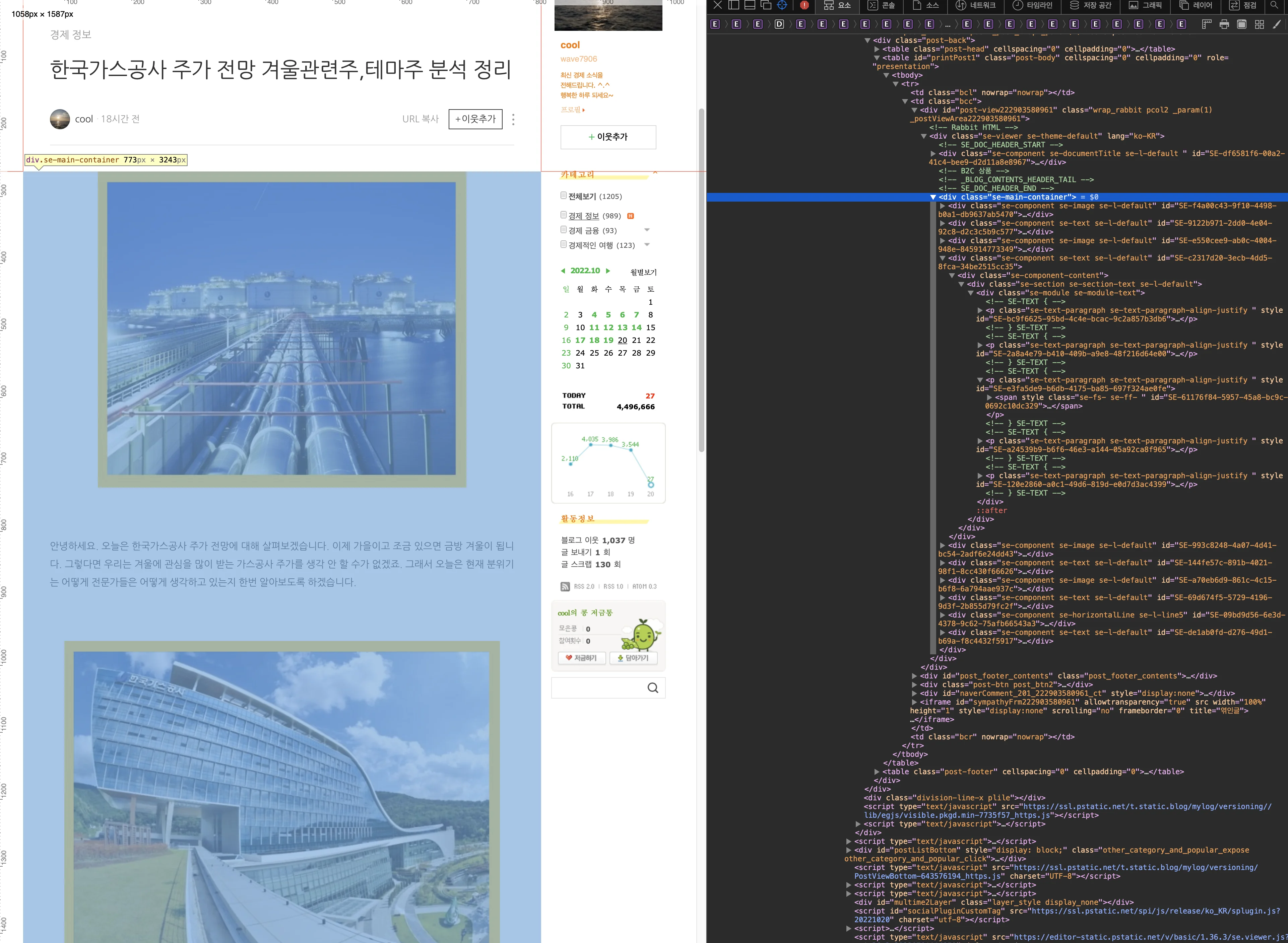 이렇게 수집한 포스팅 정보로 각 url을 순회하며 텍스트만 뽑아올 것다. 수집한 url 중 하나에 진입해서 html 태그를 살펴보자.