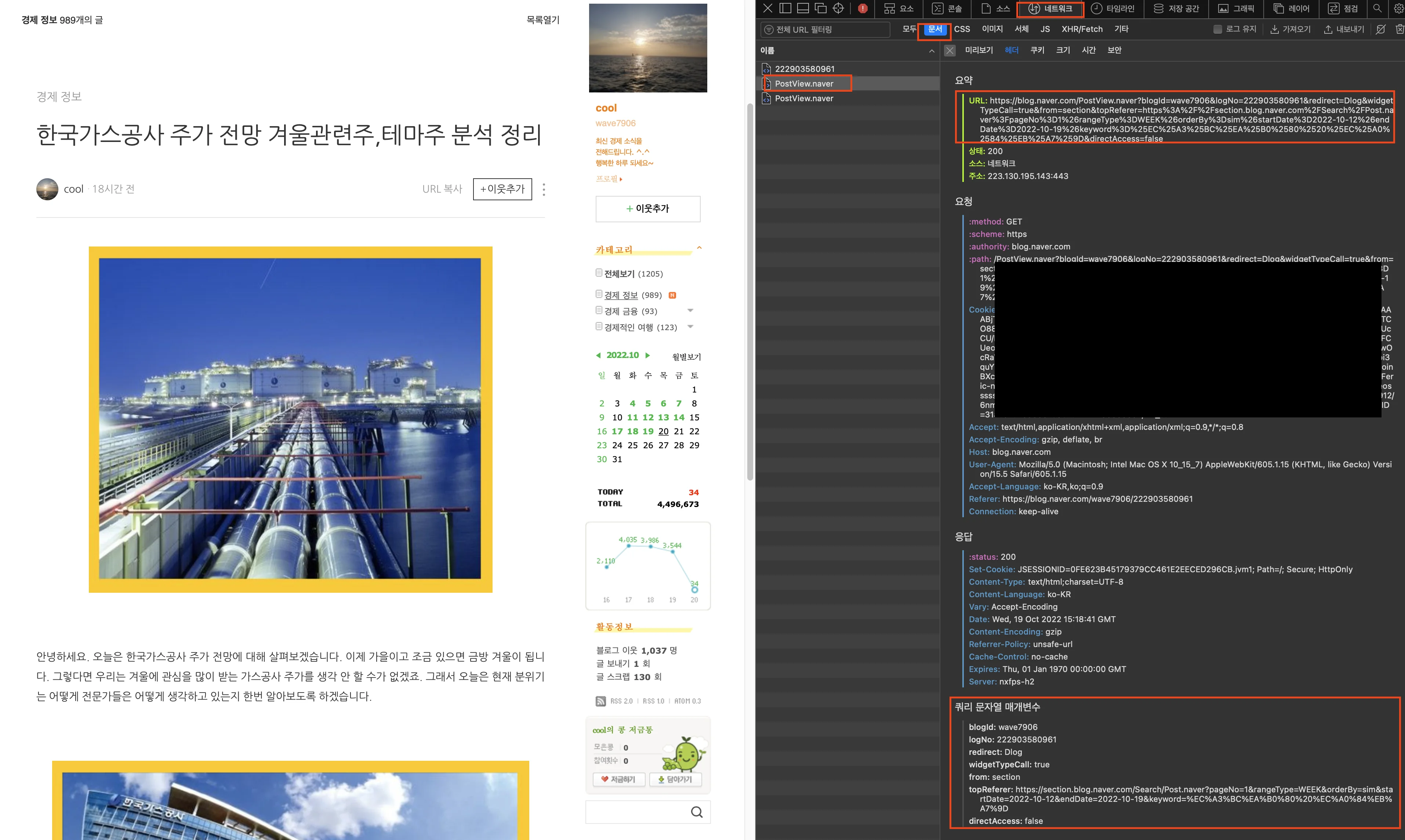 데이터 호출을 위해 이번에는 네트워크 탭의 ‘문서’를 살펴보면 PostView.naver에 우리가 찾는 본문 텍스트가 있다. 해당 데이터를 어떻게 호출할 수 있을지 url과 매개변수를 통해 살펴본다.