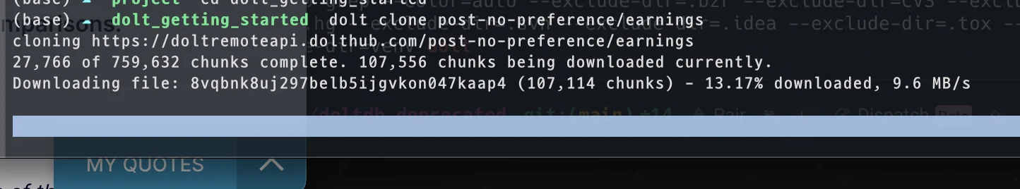 이때, 약소하게나마 대안으로 사용해 볼 수 있는 것이 다른 사람들이 공개해 둔 DB인데, DropBox나 DoltHub가 대표적이다. 코드가 익숙하다면 DoltHub에서 매우 쉽고 빠르게 DB 전체를 Pull 할 수 있으며 아래 예시로 사용한 1.26 GB짜리 재무데이터를 수 초 내에 모두 다운로드 가능하다.