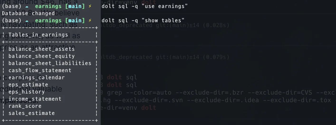 그러나 우리는 필요한 데이터를 가져오기만 하면 되기 때문에 dolt clone 명령어와 함께 필요한 repository를 지정해주면, 현재 경로 하위에 earnings라는 폴더가 생성되고, 해당 폴더 내 .dolt 폴더 역시 확인할 수 있다.