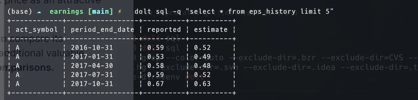 데이터가 잘 가져왔다면 dolt를 활용해 쿼리를 실행해본다. mysql이 설치되어 있다면 기본적으로 mysql, information_schema 2개의 database는 보일 것이고, 추가된 earnings database와 그 하위 table을 확인할 수 있다.
