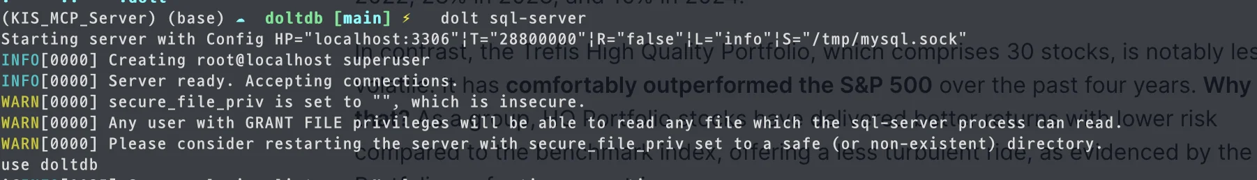 우리는 sql 서버를 dolt로 띄우고, 띄운 서버를 python으로 접근해 데이터를 쿼리 할 것이다. dolt sql-server 명령어를 수행하면 sql 로컬 서버를 기본 포트 3306번으로 띄울 수 있다.