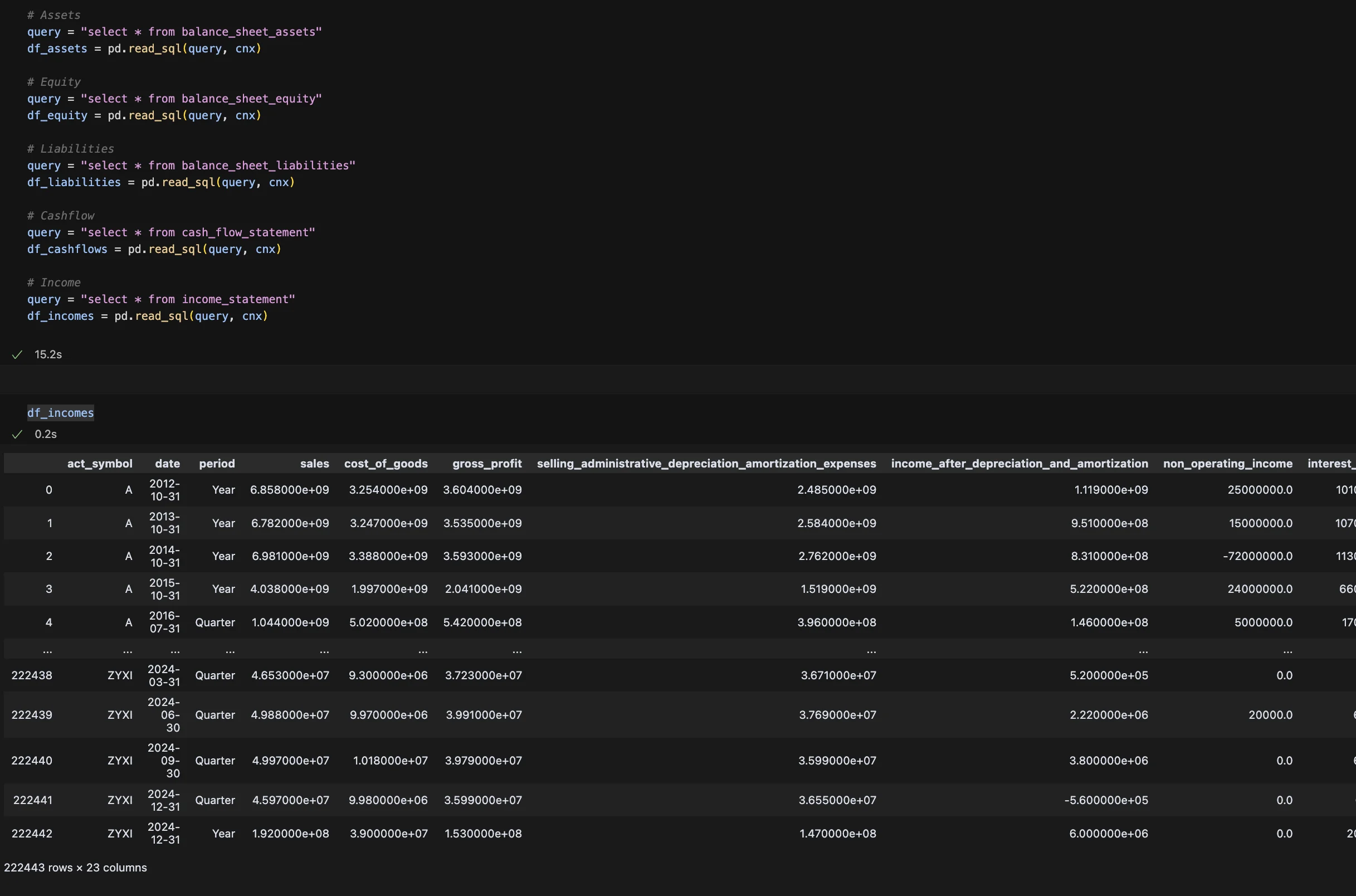 재무제표 데이터를 확보할 때 yfinance를 많이 사용하며, 긴 시계열에 대해서는 공시자료를 스크래핑하여 필요한 table 영역만 적절히 포멧팅할 수도 있다. 가장 좋은 건 yfinance 같은 무료 api를 활용해 적정 주기마다 데이터를 가져와 적재해 두는 것인데, 상장된 모든 주가 재무정보를 개인 PC나 클라우드 서버에 저장해 두는 건 개인으로서 여간 부담되는 일이 아니다.