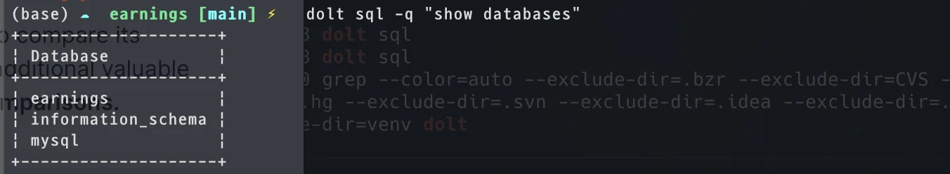 데이터가 잘 가져왔다면 dolt를 활용해 쿼리를 실행해본다. mysql이 설치되어 있다면 기본적으로 mysql, information_schema 2개의 database는 보일 것이고, 추가된 earnings database와 그 하위 table을 확인할 수 있다.
