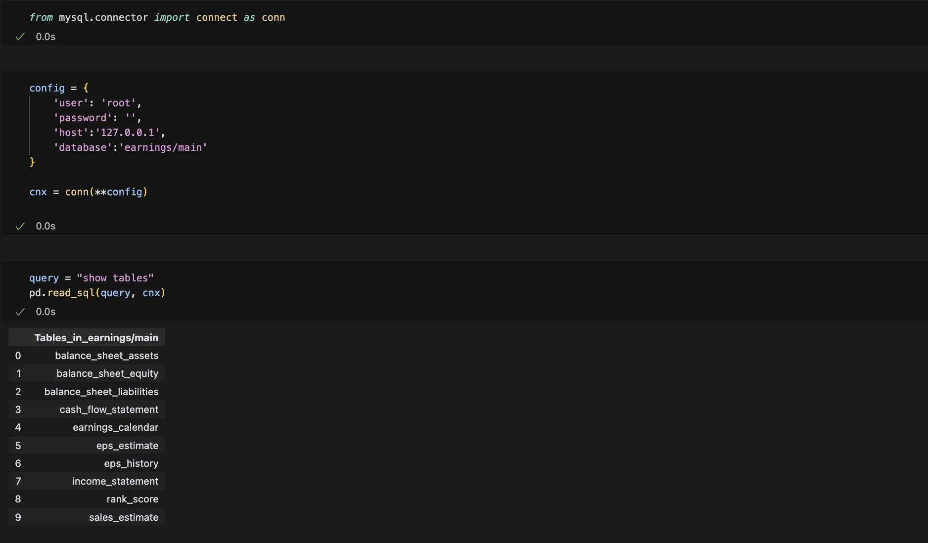이제 자유롭게 필요한 데이터를 가공해 분석에 활용할 수 있는 상태다. 위와 같이 DoltHub로 기반 DB를 clone 해서 사용할 수도 있고, yfinance 등 다른 api를 통해 주기적으로 필요한 데이터만 가공, 적재할 수도 있다.