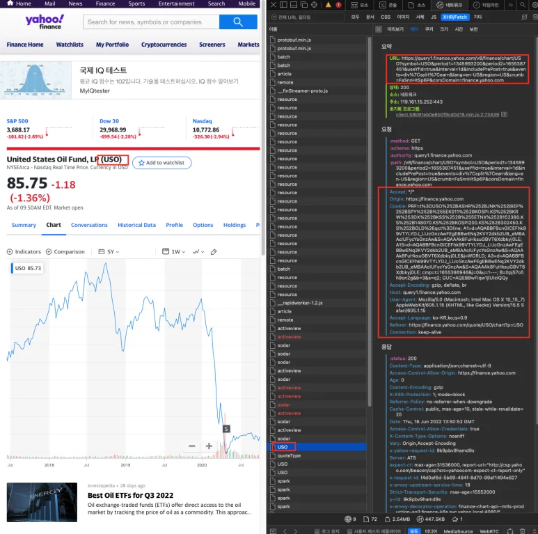 Yahoo Finance에서 종가 데이터를 수집할 것이다. 한 번의 요청으로 최대한 많은 데이터를 가져오기 위해 브라우저 네트워크 탭의 XHR 정보를 사용한다. 서버에 직접 데이터를 요청하는 것으로, url 파라미터를 수정해가며 최대 기간의 일 단위 가격 정보를 수집할 수 있다. 헤더와 url를 살펴보고, period 등 수정 가능한 구간들을 확인한다.