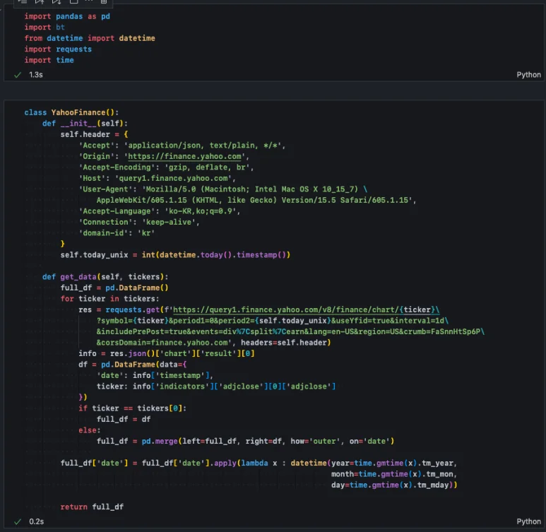 requests 패키지를 통해 데이터를 불러올 것이다. 데이터는 json 형태로 반환되므로 적절한 가공이 필요하다. 아래와 같이 클래스를 구성하면 여러 티커를 순차적으로 요청하면서 하나의 데이터 테이블에 적재할 수 있다.