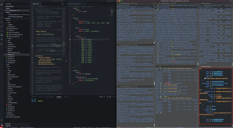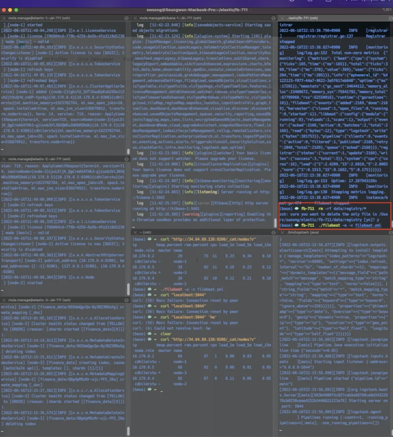 나의 경우, 맨 좌측 3개는 elastic search 원격 서버가 실행되고 있고, 중앙 상단에 kibana 원격 서버가 실행되고 있다. 그리고 맨 우측 하단에 위 명령어를 통해 logstash가 실행되고 있으며, 마지막으로 맨 우측 상단에 filebeat을 실행하는 모습이다. filebeat도 logstash처럼 실행할 때 설정 파일(yml)을 지정해 준다.