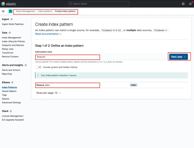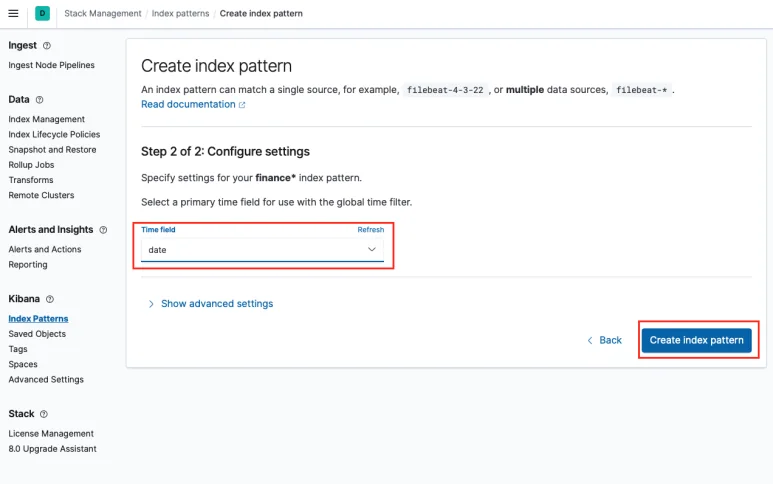 키바나에서 대시보드를 만들기 위해서는 인덱스 패턴을 설정해 줘야 한다. 이 패턴을 통해 대시보드가 각 칼럼과 데이터 타입을 인식한다. Stack Management 메뉴에 Index patterns 탭에 들어와서 진행할 수 있다.