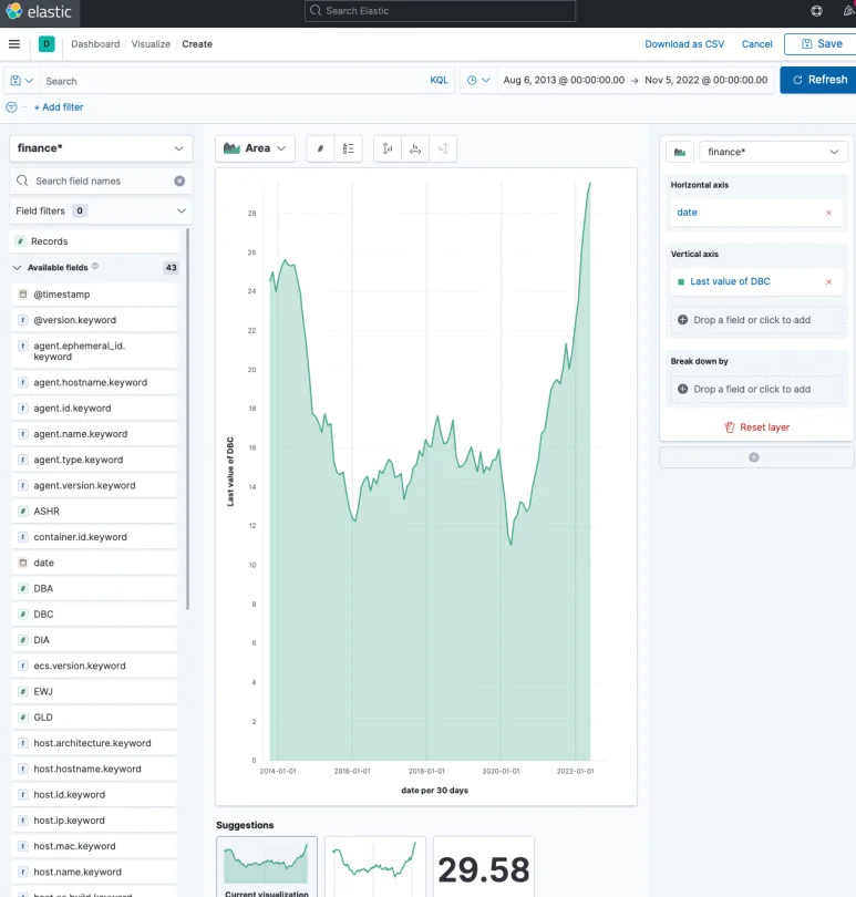 패널 생성 화면으로 들어가면 이렇게 인덱스 패턴(finance*)을 지정하고, 해당 패턴에 속하는 필드들로 차트를 구성할 수 있다. 차트를 자유롭게 구성한 다음 Save를 눌러준다.