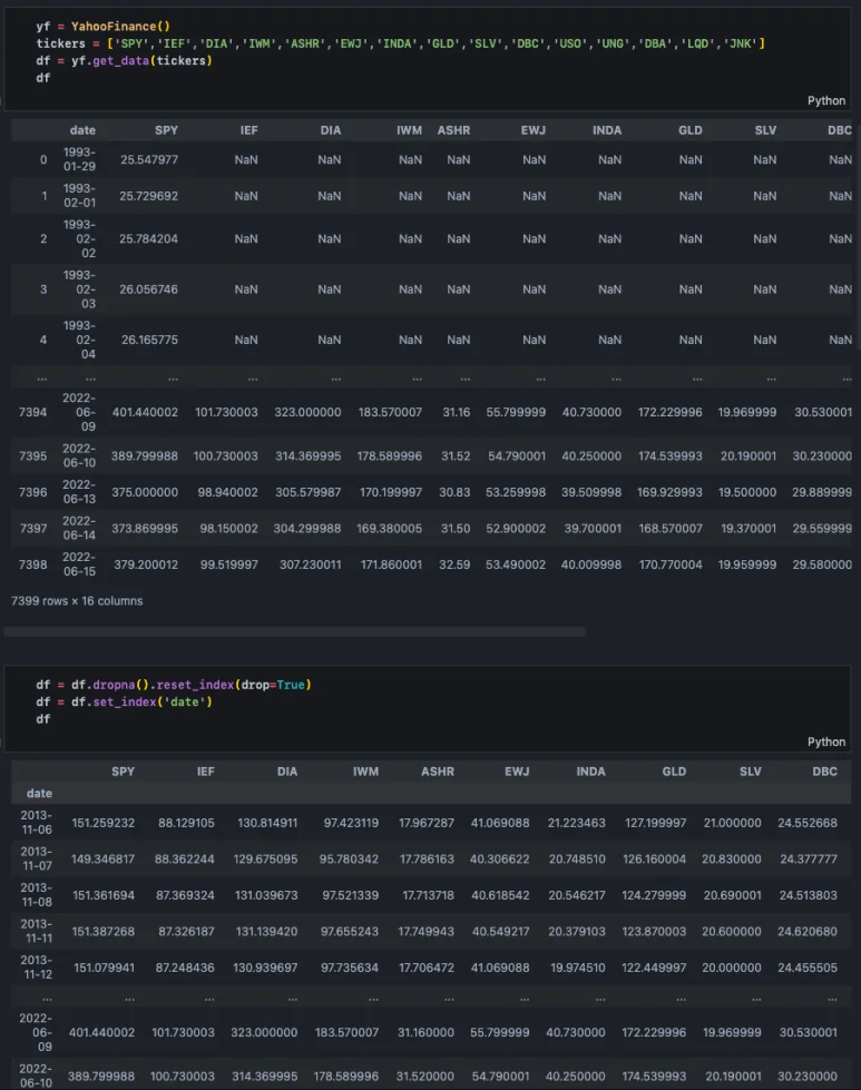 활용할 수 있는 총 15개의 국제 매크로 지수들을 티커 목록에 넣고, 위에서 만든 클래스를 통해 한 번에 데이터를 불러온다.