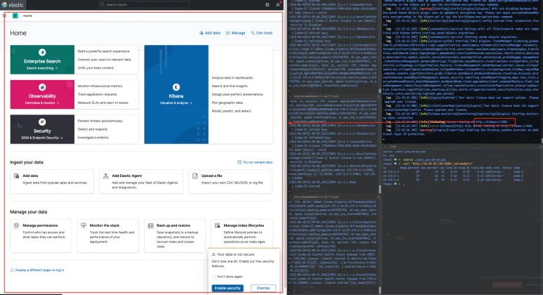 아래 이미지는 키바나를 실행한 모습, 메인 노드에 curl 명령어로 연결된 노드 정보를 검색하는 모습이다.