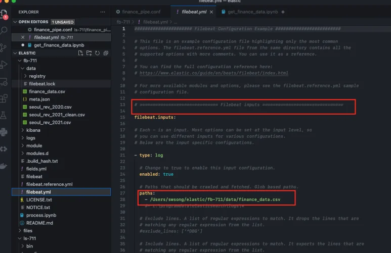 이제 수집한 데이터 파일을 beats가 인식할 수 있도록 yml 파일을 수정해 준다. Filebeat inputs 부분의 paths에 데이터 파일이 있는 경로를 작성해 주면 되겠다.